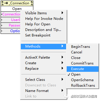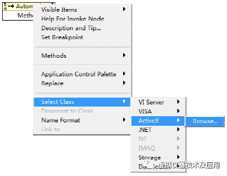 1)在框图程序(Block Diagram)窗体中放置一个Invoke Node节点(路径:All Functions-Communication-ActiveX-Invoke Node),右键点击该节点,进行如下操作: