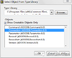 3)选择ADO控件后,按下图,勾选Show Creatable Objects Only,然后选择Connection后确定。
