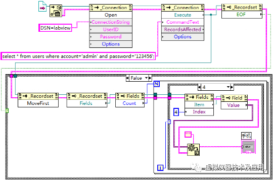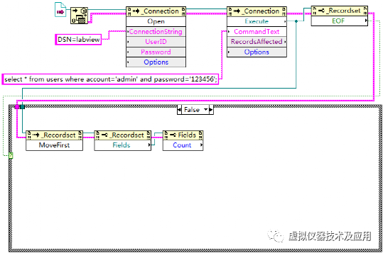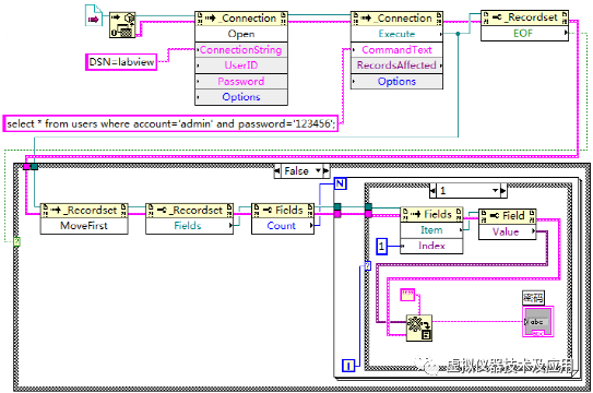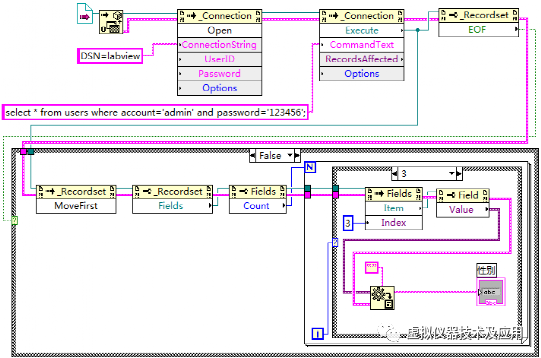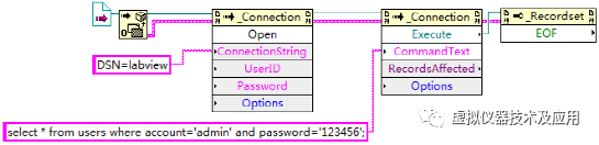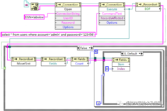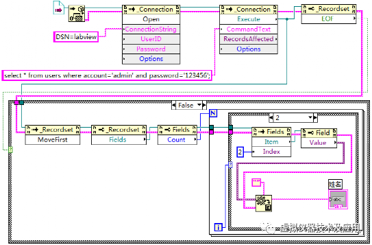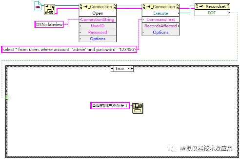 使用LabVIEW建立一个VI文件,命名为“读取指定的单条记录.vi”。在该VI中实现功能:判断用户表users中是否存在帐号为“admin”和密码为“123456”的记录,若存在,读出该条记录的所有信息并显示,若不存在,弹出对话框提示。