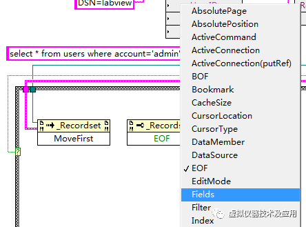 ⑦从现有程序复制方法为MoveFirst的那个Invoke Node节点,粘贴进case 0框,然后进行如下方式连接,并将其方法设置为Fields,并放置一个值为0的数字常量,连接该节点的Index端口,此时实现获取第0列的对象;