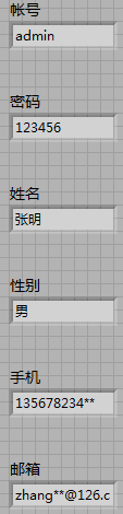 13)若case结构的输入为false(即记录存在),则用6个指示型控件分别显示查询记录的帐号、密码、姓名、性别、手机和邮箱信息,实现方法如下: