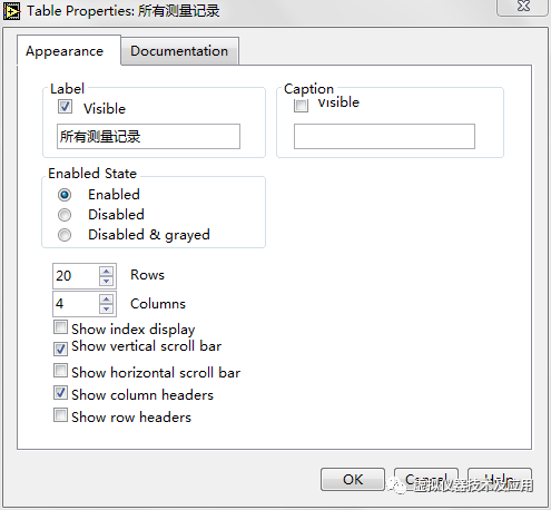 1)在前面板放置一个Table控件(路径为:All Controls—List & Table—Table),放入后右键点击该控件,选择Properties,进行如下设置: