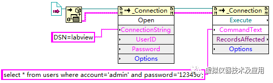 8)对放置的Invoke Node节点进行如下连接,此时程序实现了给MySQL Server发送SQL命令“select * from users where account='admin' and password='123456';”,用于查询数据表users中是否存在帐号为“admin”和密码为“123456”的记录: