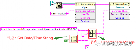 2)修改以上程序的SQL语句为符合功能要求的SQL语句,其中:Get Date/Time String节点(路径:All Controls—Time & Dialog—Get Date/Time String),以字符串的形式分别输出当前系统日期(输出当前:date string)和时间(输出端口:time string);Concatenate Strings节点(路径:All Controls—String—Concatenate Strings)用于将各字符串合成为一条类似“insert into threcords(temperature,humidity,recordtime) values(25.1,60,'2022-6-6 9:34:23’); ”的完整SQL语句;
