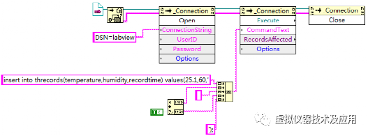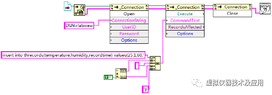 使用LabVIEW建立一个VI文件,命名为“插入记录.vi”。在该VI中实现功能:在threcords中插入一条指定的记录,温度为25.1度,湿度为60,测量时间为当前系统时间。