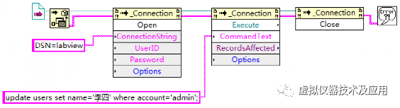 使用LabVIEW建立一个VI文件,命名为“修改记录.vi”。在该VI中实现功能:修改uses表中帐号为“admin”的用户的姓名为“李四”。