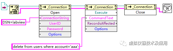 使用LabVIEW建立一个VI文件,命名为“删除记录.vi”。在该VI中实现功能:删除uses表中帐号(account)为“aaa”的记录(为了设计后的测试,要先在数据库手工添加1条帐号(account)为“aaa”的记录)。