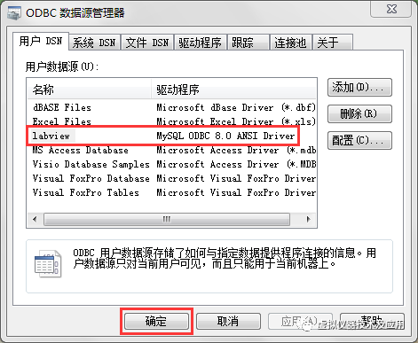 ④可在下面的窗体中发现数据源“labview”已经建立,点击“确定”按钮后完成本次ODBC数据源建立工作。