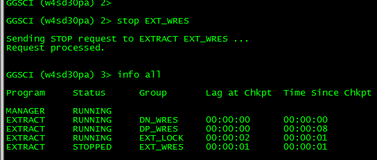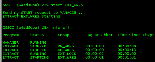 观察两个投递进程的RBA均不再变化后,启动源端抽取进程,并观察是否再次抽取到DML操作,确认进程正常(源端重启抽取进程后确认进程正常非常重要,整个数据库迁移过程中最不能出问题的就是源端抽取进程)
