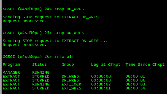 观察源端抽取进程的RBA不再变化后,停掉两个源端投递进程,保证新库和老目标端数据均暂不变化