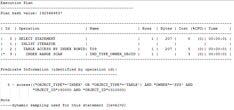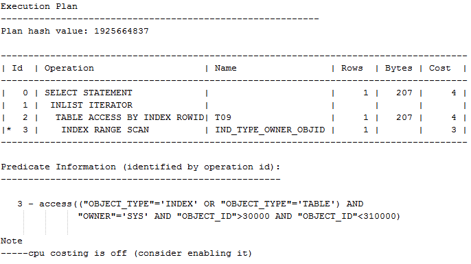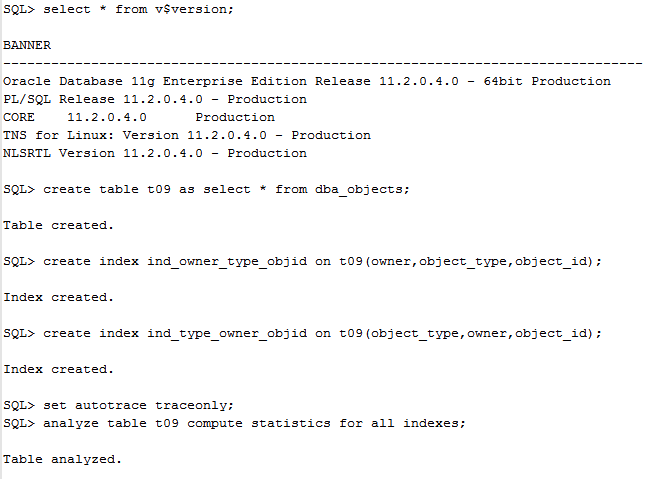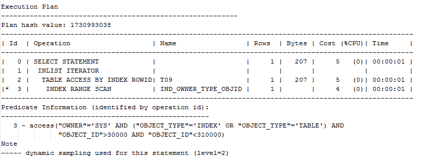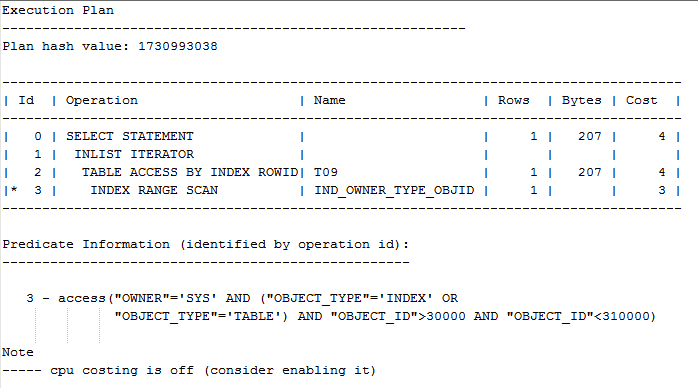 该sql语句需要在 owner、object_type、object_id 上创建复合索引,这个复合索引创建顺序如何,这里我们只考虑让该 sql 的执行计划最优秀,不用考虑别的SQL能够共用该索引,下面我们来看看两种复合索引的性能和执行计划。