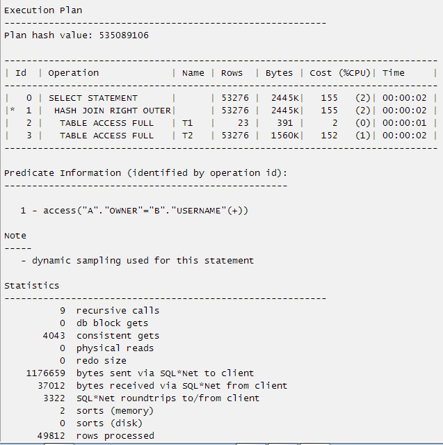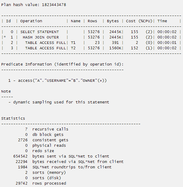 SQL> select a.object_id,b.username from t2 a,t1 b where a.owner=b.username(+) ;