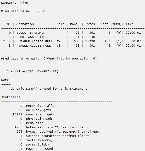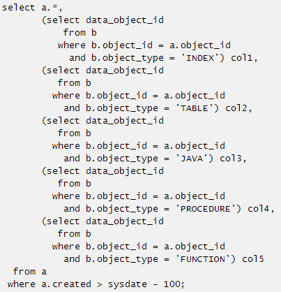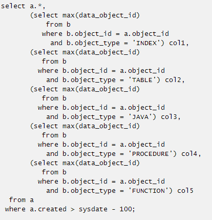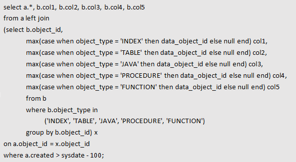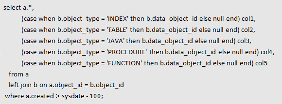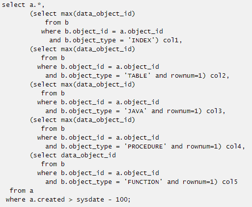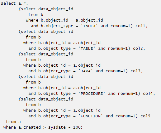 比如b表中有两行数据都满足b.object_id = a.object_id and b.object_type = 'INDEX'条件,rownum=1后oracle会根据b表的执行计划取到第一条后就返回,这两行数据都有可能取到,具体取哪一行要决定B表的访问方式是索引扫描还是全表扫描等,而在这个SQL本意中无论取哪一条都是满足业务需求的。那么这个标量子查询则可以简化为: