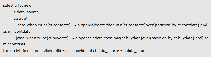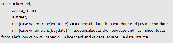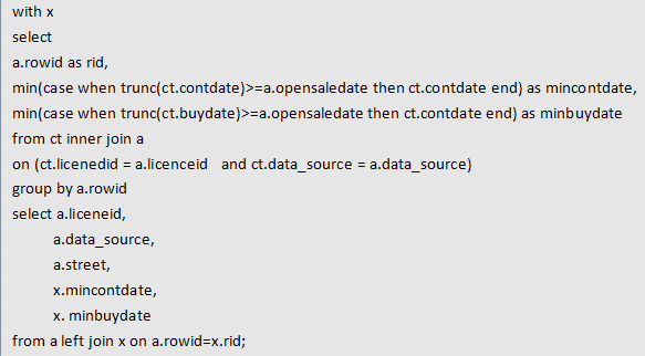 trunc(ct.buydate)>=a.opensaledate条件的a.rowid、min(contdate)和min(buydate)数据,同样有min函数如果需要将这些满足条件的数据输出需要再次关联一次a表,而比较容易的就是将满足条件的rowid去和a表重复做left join,满足a.rowid=x.rid就全部输出,不满足在的就补全null