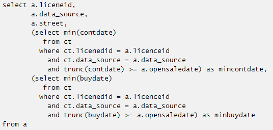 这个SQL主要是在标量子查询中用了聚合函数min和非等值关联trunc(contdate) >= a.opensaledate和trunc(buydate) >= a.opensaledate,聚合函数可以参考我们之前的写法用group by先行构造,但是非等值连接如何改写了。