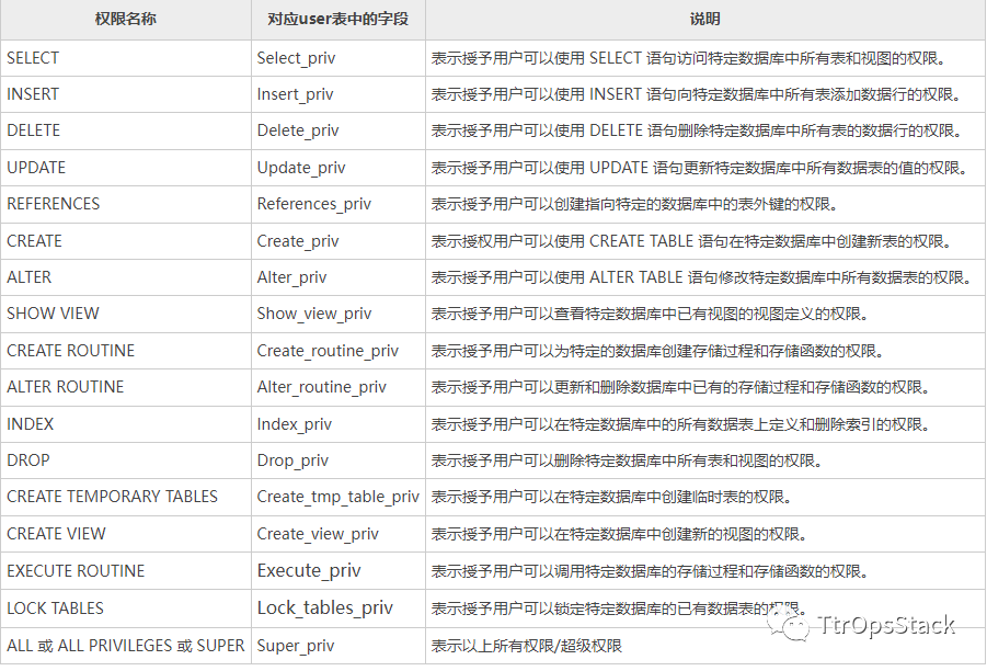 CREATE USER:表示授予用户可以创建和删除新用户的权限。 SHOW DATABASES:表示授予用户可以使用 SHOW DATABASES 语句查看所有已有的数据库的定义的权限。