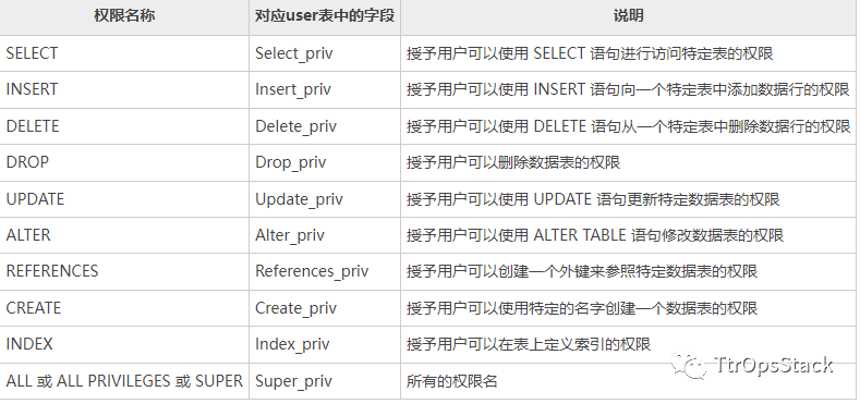 授予用户权限时,<权限类型>除了可以指定为授予数据库权限时的所有值之外,还可以是下面这些值: