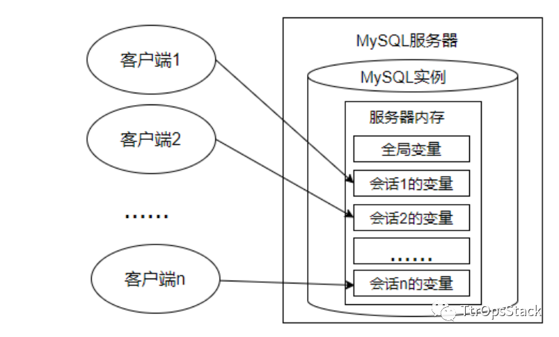 每一个MySQL客户端成功连接MySQL服务器后,都会产生与之对应的会话。会话期间,MySQL服务实例会在MySQL服务器内存中生成与该会话对应的会话系统变量,这些会话系统变量的初始值是全局系统变量值的复制。如下图: