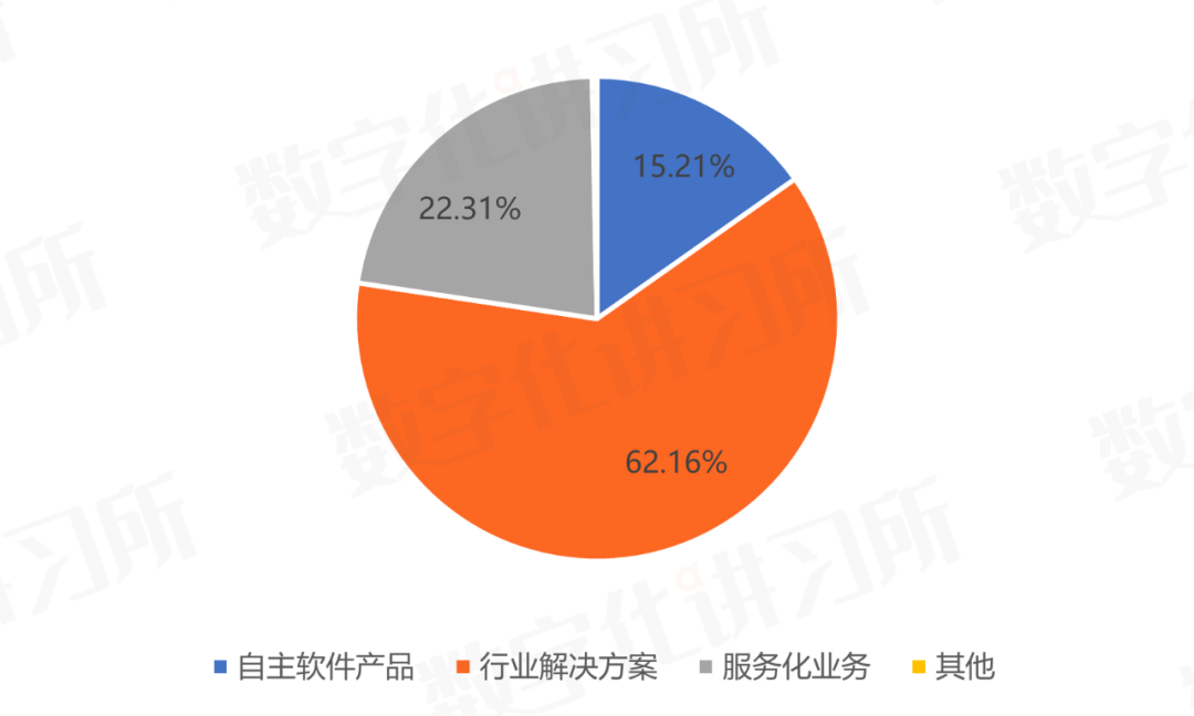 中国软件的主营业务为自主软件产品、行业解决方案和服务化业务。从收入结构来看,行业解决方案为公司主要营收来源。根据中国软件2021年年度报告,自主软件产品实现营收15.74亿元,同比增长78.18%,营收占比15.21%;行业解决方案实现营收64.35亿元,同比增长39.31%,营收占比62.16%;服务化业务实现营收23.09亿元,同比增长23.38%,营收占比22.31%。此外,公司在金融机构端持续发力,研发新一代统一监管报送平台,构建智慧监管体系,贡献部分营收。