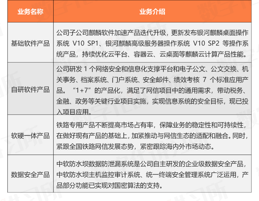 中国软件的自主软件产品业务以基础软件和数据安全产品为核心,打造本质安全产品体系;以铁路专用通信产品为核心,打造软硬结合产品体系。同时,围绕自主安全核心业务,构建生态环境,促进公司自主软件产品创新发展。