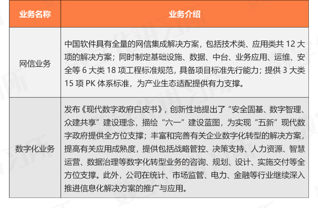 中国软件主营业务为自主软件产品、行业解决方案和服务化业务。自主软件产品主要包括以操作系统为代表的基础软件产品、以中软防水坝为代表的数据安全及铁路专用产品;行业解决方案包括信息系统集成、国产软硬件产品改造升级等;服务化业务主要为税务行业的信息系统运维和金融监管服务等。