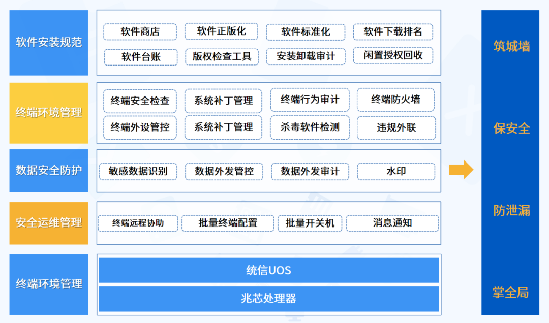 ①桌面安全管理:提供统一的终端安全漏洞检查、安全加固、安全隔离体系;
