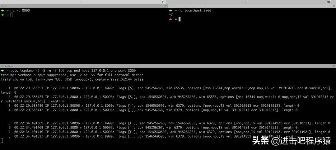 上图是我使用 nc 命令配合 tcpdump 抓包工具演示的一次三次握手与四次挥手的过程。这个实验非常简单,只要你有搭载 Linux 或者 MacOS 的主机,就可以轻松的进行这个实验。实验步骤如下: