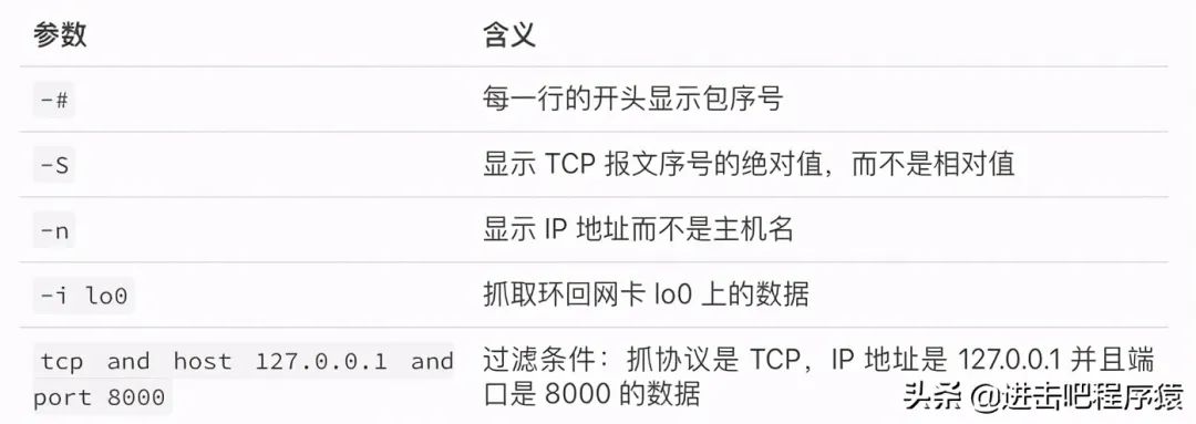 好,咱们简单分析一下 tcpdump 命令的参数含义,以及报文的含义。