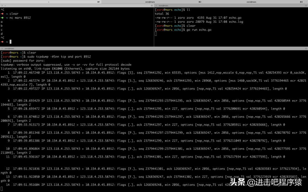 来看一个发生在互联网上的例子,这次我的服务器位于腾讯云主机上。建立 TCP 连接后,我从客户端发送了 4 次数据到一个名为 mars 的服务器上,第一次发送一个字母 a 再加一个字节的回车 \n,第二次发送了一个字母 b 加回车 \n,后面还有 c, d 同理。