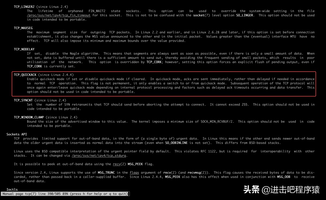 好,接下来再谈谈 echo 是怎么把 Delay ACK 机制打开的。非常简单,你使用 man 手册查阅 man 7 tcp,就能看到一些关于 TCP 机制的文档,其中有一项是 TCPQUICKACK。