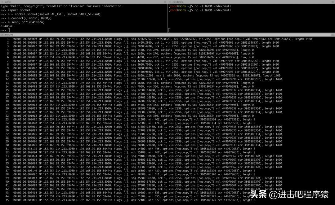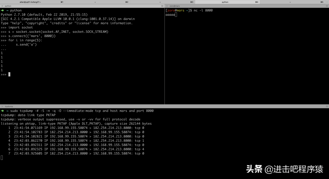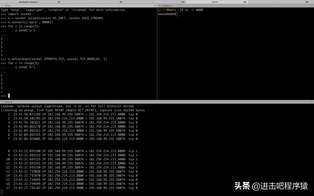 这个实验看起来没那么容易做,如何在极短的时间里发送多个小分组呢?继续使用 nc 命令可以吗?第一次发送 a,第二次再输入一个 b回车发送,第三次输入c 回车发送出去。很遗憾,哪怕你单身 30 年,你的手速也不可能突破到 100ms 以内,还没等你 b 输入进来,a 的 ACK 就已经收到了,所以这样实验的话,你永远看不到 Nagle 是如何合并小分组这个过程。