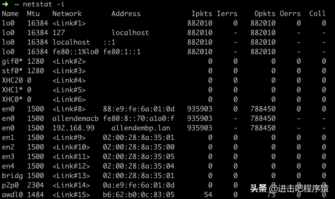 实际上,链路层对这种帧数据长度的限制称为最大传输单元(Maximum Transmission Unit, MTU)。不同的链路层协议,对 MTU 的值也有所规定,通常这个值可以进行更改。使用命令 netstat -i 可以看到自己的网卡的 MTU 值。