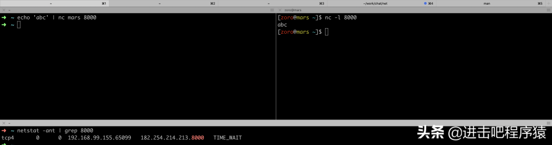 Step.4 右上窗口输入 nc localhost 8000 表示向 localhost:8000 这个地址发起 TCP 连接请求。