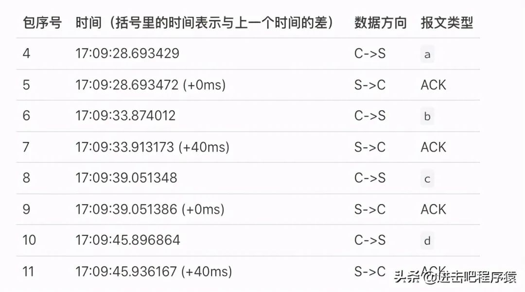 客户端发送 b(第 6 包)到服务器后,服务器没有立即返回 ACK,而是等待了约 40ms 才返回 ACK(第 7 包)到客户端。