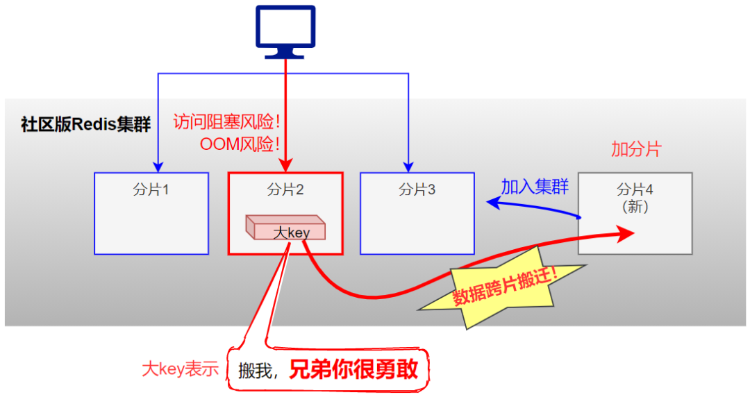 社区版Redis存储大key会导致分片内存消耗不均,随着集群整体数据量水位提升,大key所在分片随时有OOM风险。