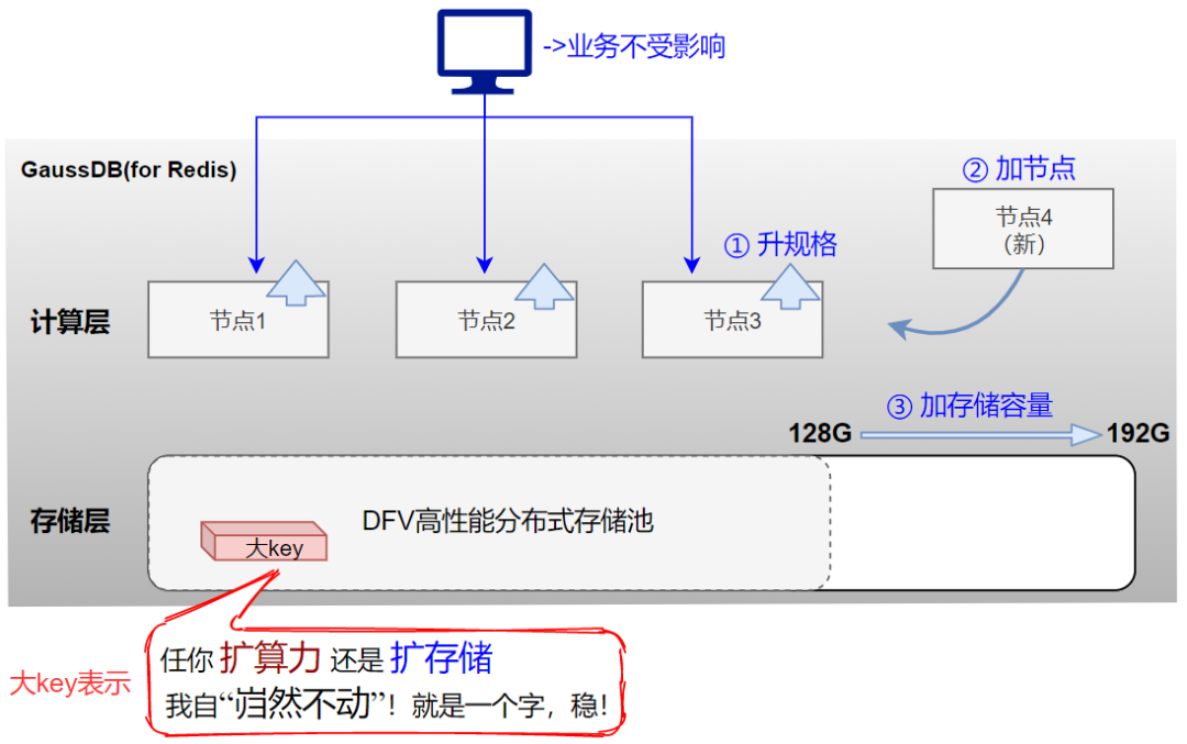 高斯Redis支持秒级扩容,并支持升规格、加节点、加存储容量3种手段灵活扩容,运维体验极佳。