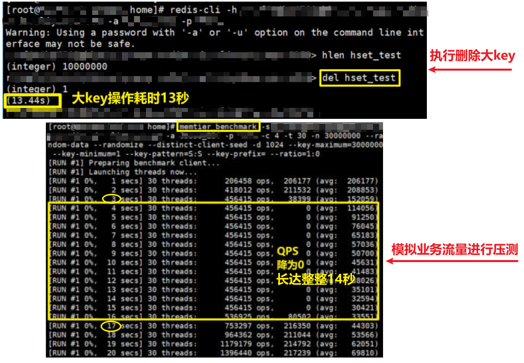 社区版Redis大key的删除/过期都会导致访问严重阻塞。实测删除/过期一个大hash key(包含1000w个元素),社区版Redis访问阻塞长达整整14秒。