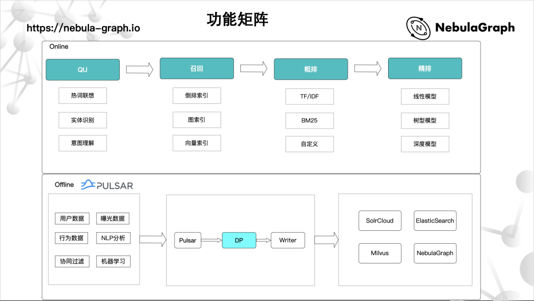 从功能上来说,从矩阵图我们可以了解到做搜索和推荐时,系统分为 Online 和 Offline 两个部分。