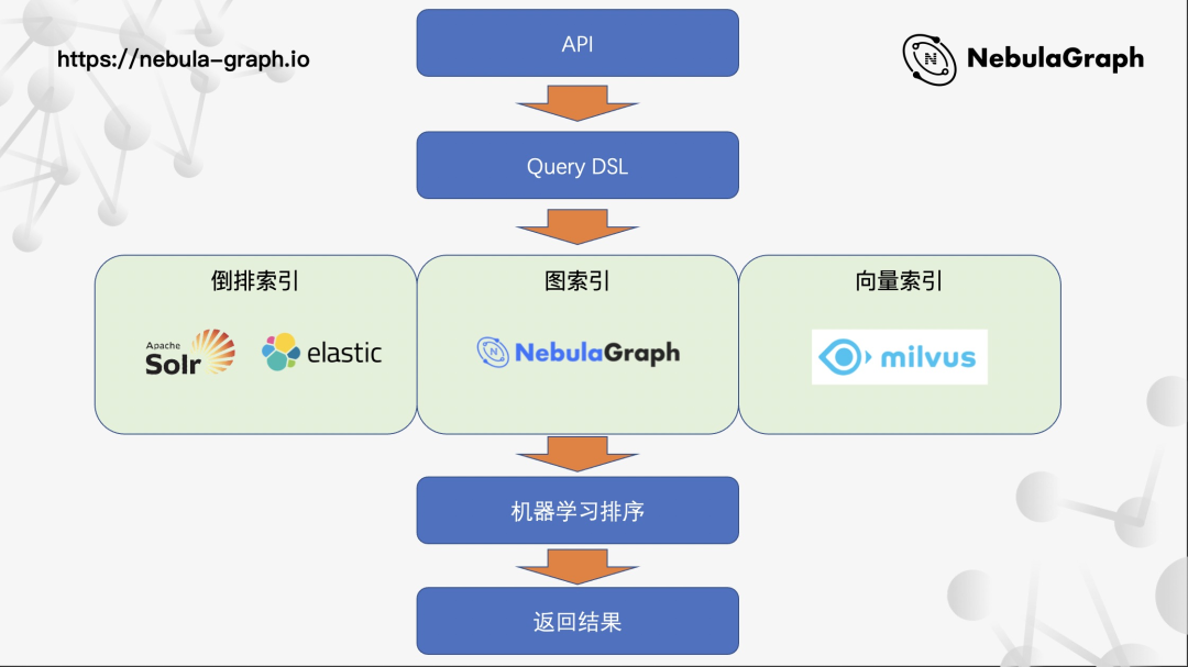 通过上面这种方式,我们统一了 DSL,无论是 Nebula 还是 Solr、还是 Milvus 都可以统一成一套用法,一个 DSL 便能调用不同的索引。
