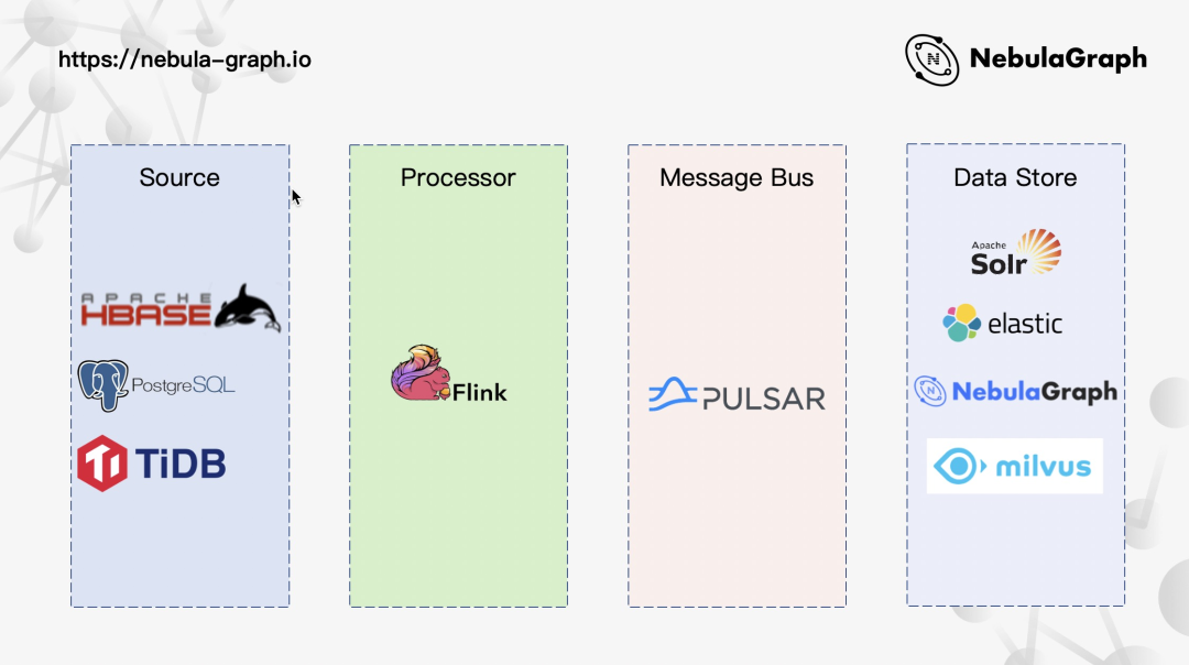 最下层,是大数据平台,对接 Pulsar、Flink、HBase、HIVE、Redis、TiDB 等数据源。
