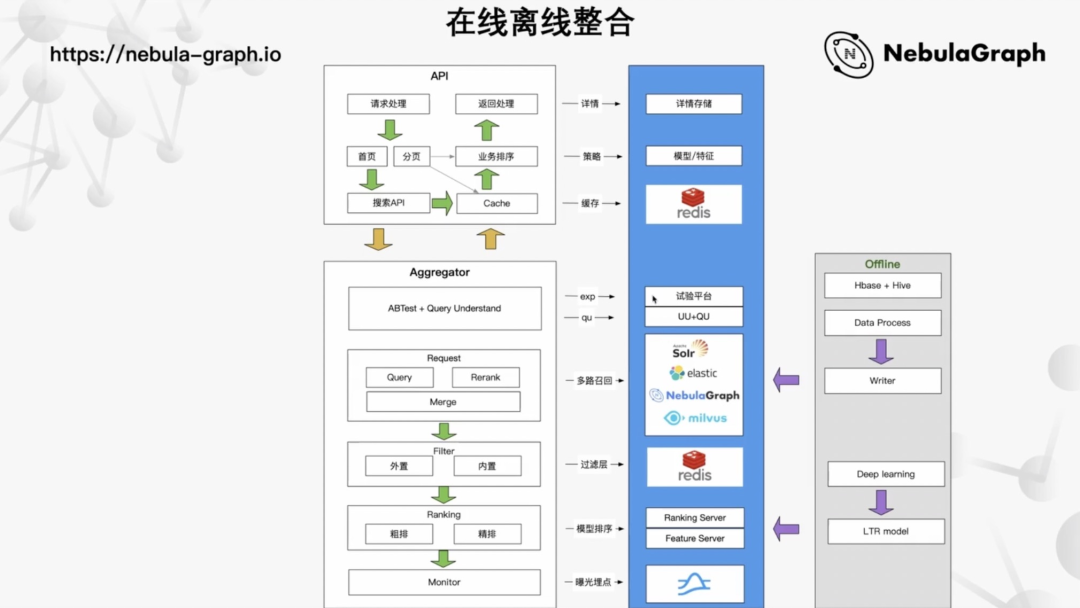 上述为在线 Online 流程,相对应的还有一套 Offline,离线流程。离线部分主要是整个业务的数据加工处理工作,把用户的相关行为,例如:数据采集、数据加工,再把数据最终写到召回引擎,像是上文提及过的倒排索引的 Solr 和 ES、图索引的 Nebula Graph 以及向量索引的 Milvus,以提供线上的召回能力。