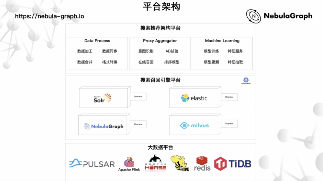 在搜索推荐架构平台下方,便是搜索召回引擎,由 Solr、Elasticsearch、Nebula Graph、Milvus 组成,分别负责倒排索引、图索引和向量索引。