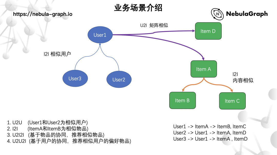上面 U2U 是在创建 user to user 的某种关系,可能是矩阵(向量级别)相似,也可能是行为级别的相似。1. 和 2. 是基本的协同(相似性),把用户和用户、物品和物品建立好关系,基于这种基本协同再延伸出更复杂的关系,比如:通过物品的协同给用户推荐相似物品,或是根据用户的协同,推荐相似用户的偏好物品。简单来说,这个场景主要是实现用户通过某种关系,可得到相关物品的相似推荐或者是相似用户的关联物品推荐。