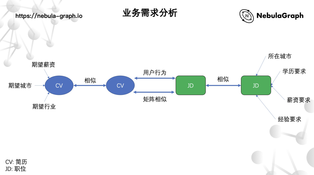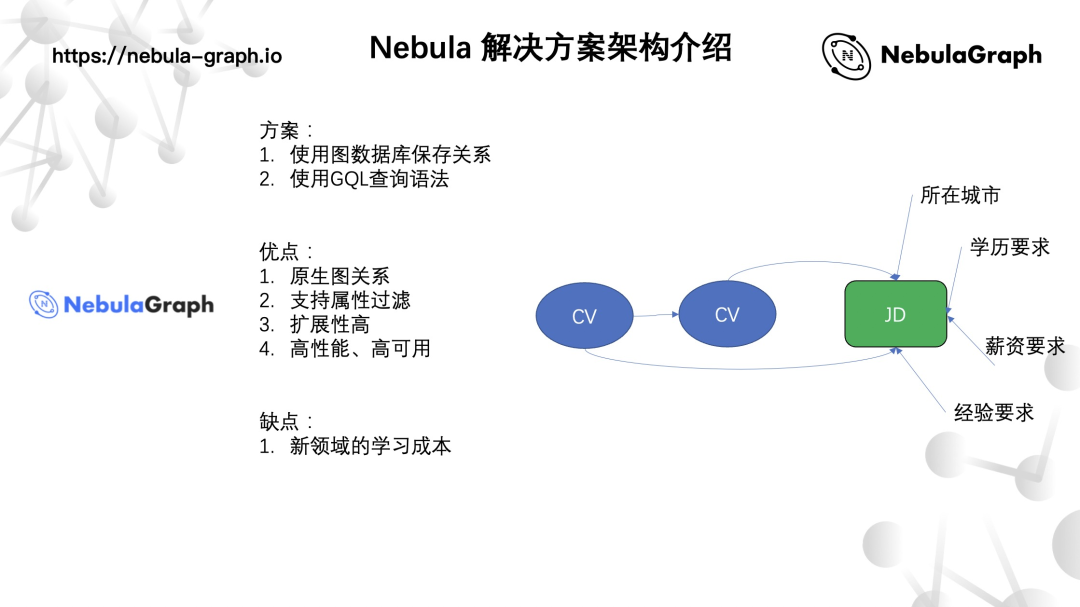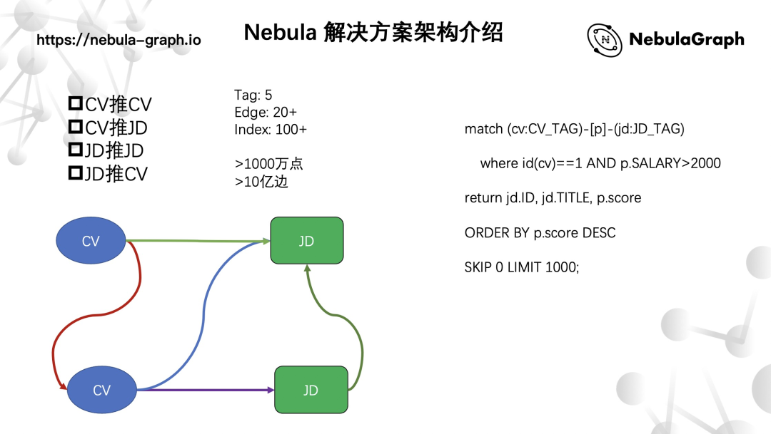 经过我们调研,业界对 Nebula Graph 评价挺高,智联这边用了 Nebula Graph 来实现图索引。像刚在 U2U 和 U2I 的场景,通过图的方式把 CV 和 JD 存储成点,边则存储关系。至于属性过滤,如上图所示将 JD 诸如所在城市、学历要求、薪资要求、经验要求等属性存储为点的属性;而相关性的话,则在关系边上存了一个“分”,最终通过分进行相关性排序。