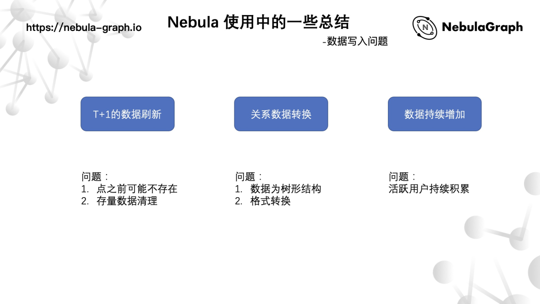 首先 T+1 数据刷新。展开来说,因为数据是提前加工的,要给在线业务使用的话,涉及了 T+1 数据刷新问题。刷数据的话,一开始可能是个冷数据,或者是没有数据,刷新的时候是直接写入关系数据,这个边数据可能连起始点都没有。整个边数据刷新之后,就需要将不存在的点插入。所以这里有个改进点,我们先插入点数据之后再写入边数据,这样关系能更好地创建起来。数据刷新这块还有个问题,就是边数据是 T+1 跑出来的,所以前一天的数据已经失效了,这里就需要把已经存在的关系删掉,再将新的关系写入。