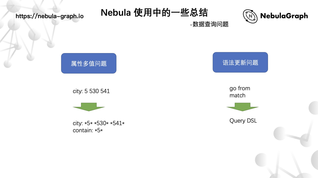 最后一个是语法更新问题,因为我们是从 v2.0.1 开始使用的 Nebula Graph,后来升级到了 v2.6,经历了语法迭代——从最开始的 GO FROM 切换到了 MATCH。本身来说,写业务的同学并不关心底层使用了何种查询语法。于是,这里智联实现了一个 DSL,在查询语言上层抽象一层进行语法转换,将业务的语法转换成对应的 nGQL 查询语法。加入 DSL 的好处还在于场景的查询语句不再拘泥于单一的语法,如果用 MATCH 实现效果好就用 MATCH,用 GO 实现好就采用 GO。