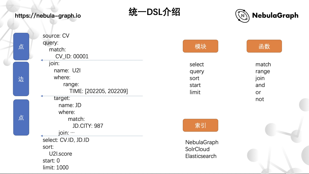上图便是统一 DSL 的大概想法,首先从一个点(CV)出发(上图上方蓝色块),去 join 某条边(上图中间蓝色块),再落到某个点上(上图下方蓝色块),最终通过 select 来输出字段,以及 sort 来进行排序,以及 limit 分页。