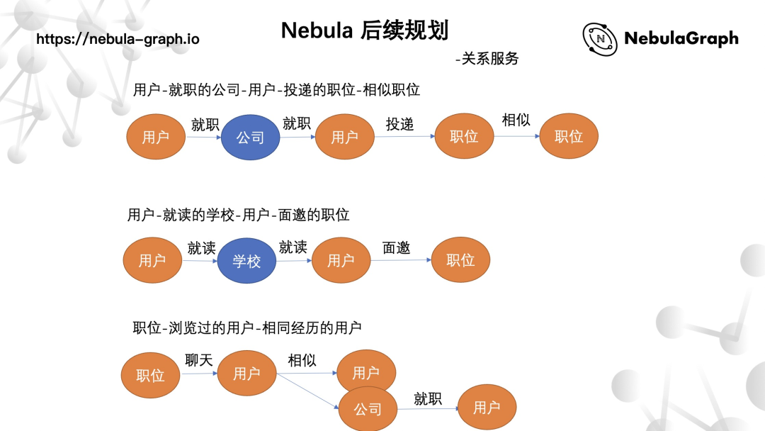 而智联的下一步尝试便是构建起这种复杂的关系网络,再做些比较有意思的事情。例如,某个用户在公司 A 就职过,于是通过这个关系查询出他的同事,再进行相关性推荐;或者是用户同校的上一届学生 下届学生倾向投递某个职位或者公司,这种都可以进行相关推荐;像用户投递的这个职位曾经和谁聊过天这种行为数据,这个用户的求职意向要求:薪资水平、城市、领域行业等信息,都可以通过在线的方式进行关联推荐。