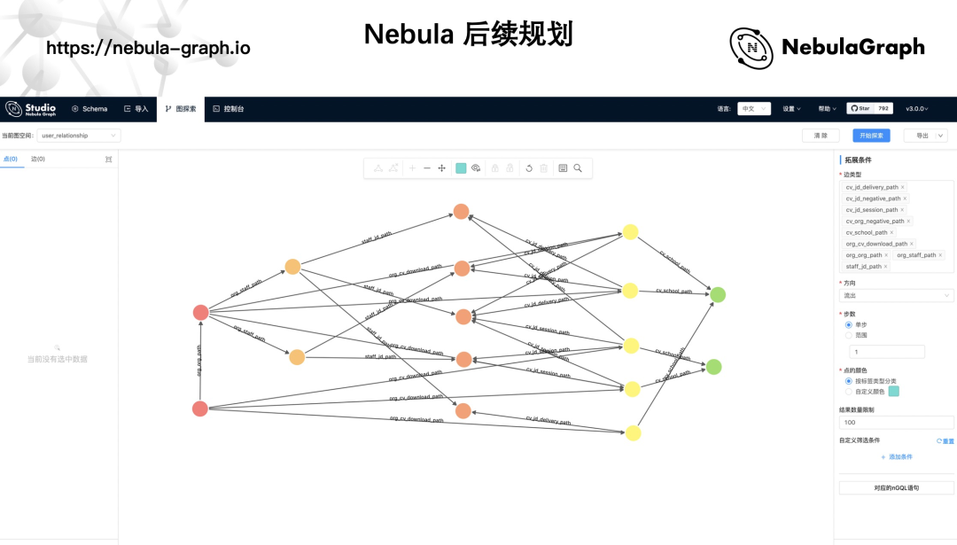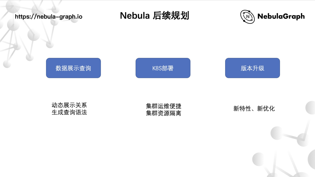 最后一点是,进行 Nebula Graph 的版本升级。目前,智联用的是 v2.6 版本,其实社区发布的 v3.0 中提到了对 MATCH 进行了性能优化,这块我们后续将会尝试进行版本升级。