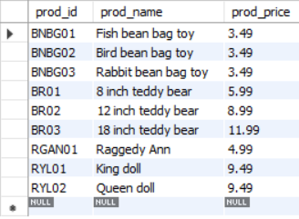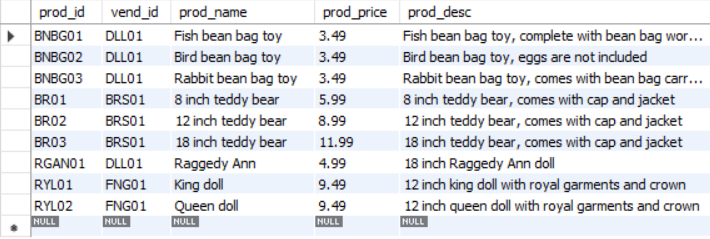 语句从products表中检索3个名为prod_id, prod_name, prod_price的列。